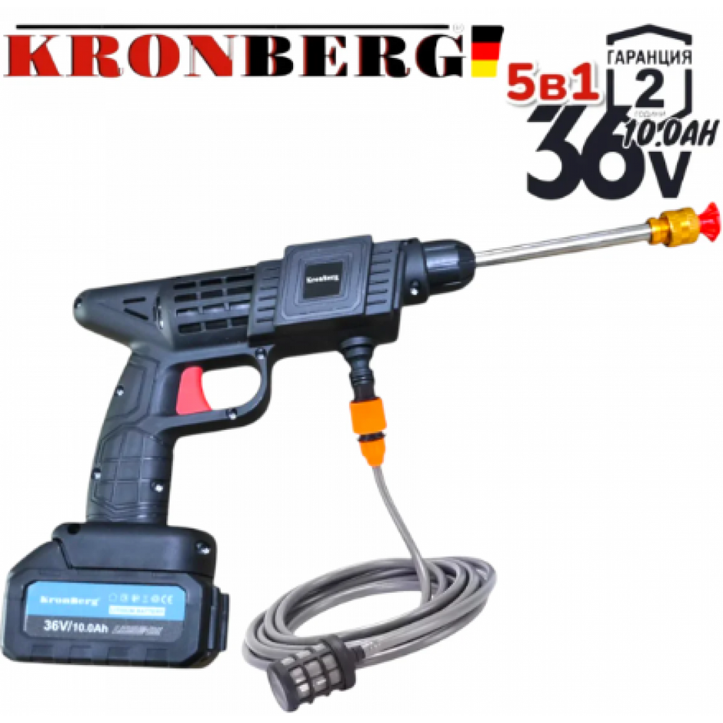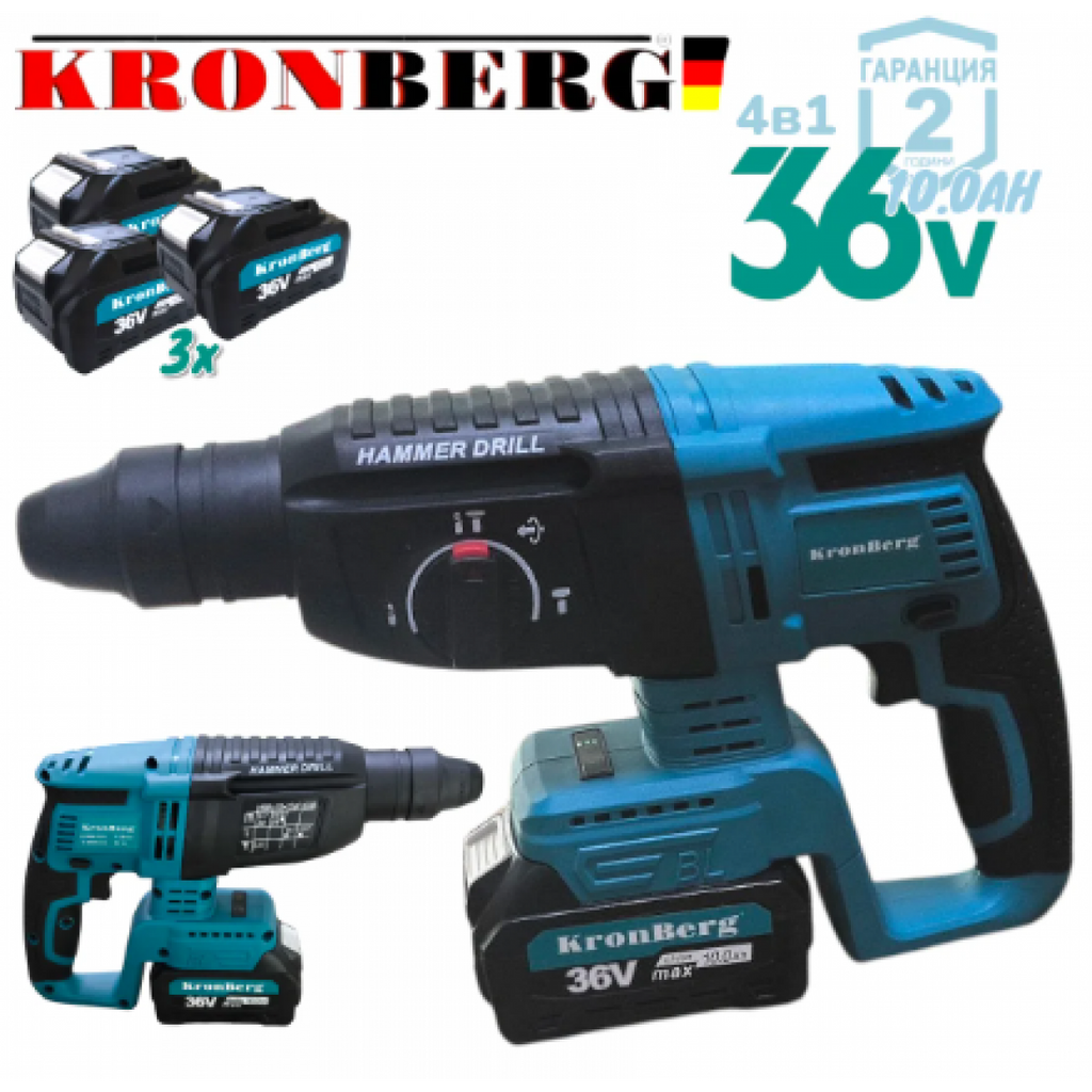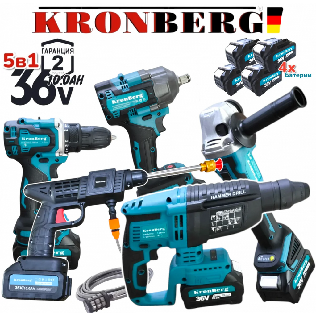 Акумулаторен Комплект Водоструйка Перфоратор Винтоверт Гайковерт-Импакт и Ъглошлайф 36V 10AH KRONBERG 5в1 с 4 Батерии