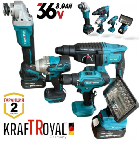 Акумулаторен Перфоратор Акумулаторен Ъглошлайф 125мм Акумулаторен Гайковерт/Импакт Акумулаторен Винтоверт 36V Акумулаторен Прожектор USB Лампа. 36V 8,0AH с 3 броя батерии и зарядно в куфар
