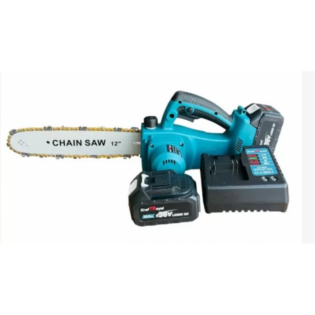 Новият акумулаторен верижен трион KraftRoyal e захранван от две батерии по 36V. Той е високоефективен и с ниско ниво на шум при работа. Меката ръкохватка предпазва от приплъзване. Има регулируемо автоматично смазване на веригата. Индикатор показва нивото на зареденост на батериите. Веригата се настройва и опъва безпроблемно и не е необходимо да разполагате с инструмент. Спирачката се активира с помощта на предния предпазител за ръката. Ниското ниво на шум прави инструмента подходящ за използване на обществени места или в жилищни комплекси. Удобната предна ръкохватка и ергономичният корпус идеално пасват на ръцете на потребителя и осигуряват по-голям комфорт и ефективност по време на работа с инструмента.