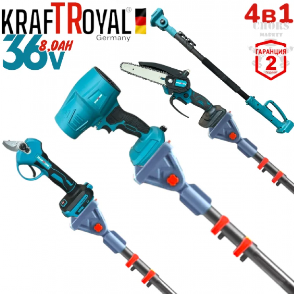 Комплект 4в1 Акумулаторна Духалка за Листа Лозарска Ножица Резачка за Клони (Автоматично Смазване на Веригата) Телескопичен Прът KRAFTROYAL 36V 8,0AH