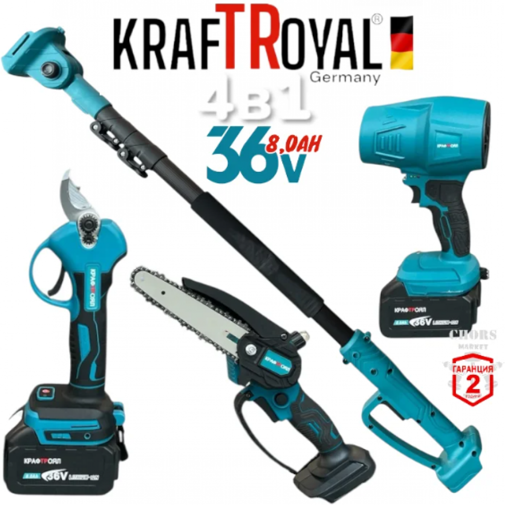 Градински Комплект 4в1 Акумулаторна Духалка за Листа 36V Акумулаторна Резачка за Клони 36V с Автоматично Смазване на Веригата Лозарска Ножица 36V и Телескопичен Прът 2.5м KRAFTROYAL с 2 Батерии