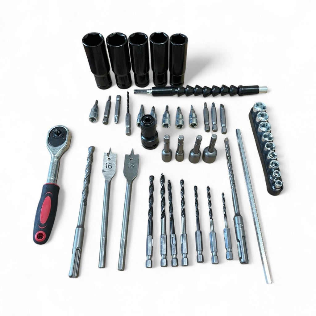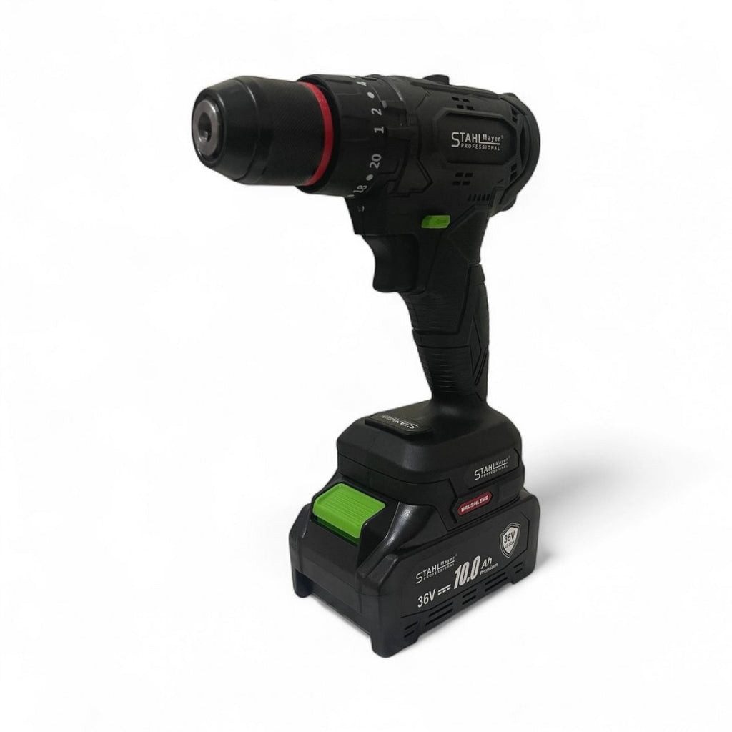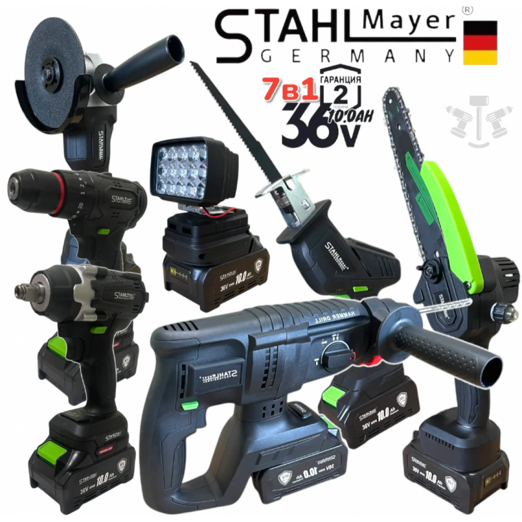 Комплект 7 в 1 от акумулаторен перфоратор, винтоверт, гайковерт, ъглошлайф, саблен трион , верижен трион и LED лампа 36V 10Ah - с 4 батерии и части в куфар StahlMayer Black