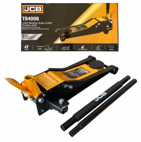 Професионален сервизен крик на марката JCB с товароподемност 4 тона, с две помпи и усилена конструкция. Крикът е снабден с педал за бързо повдигане.
