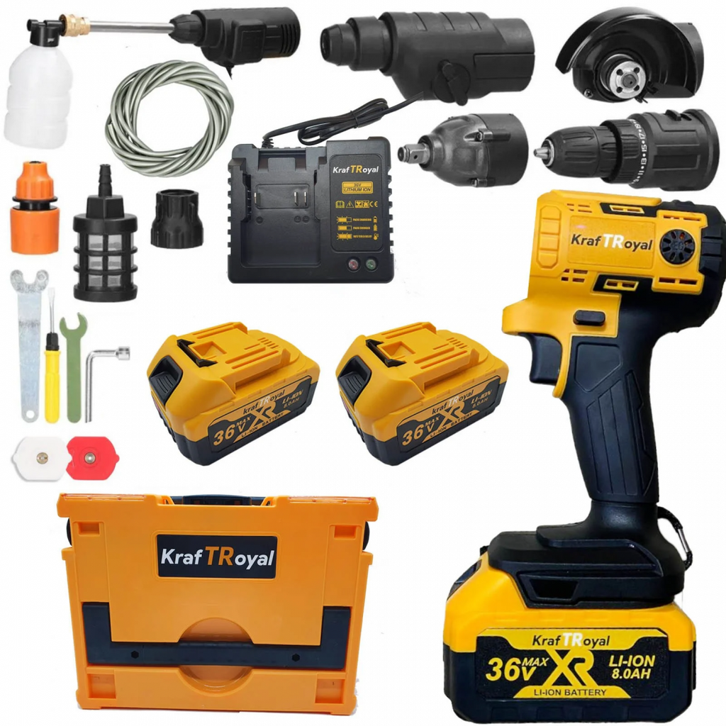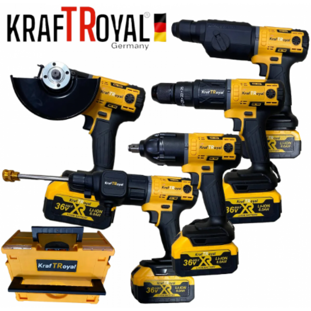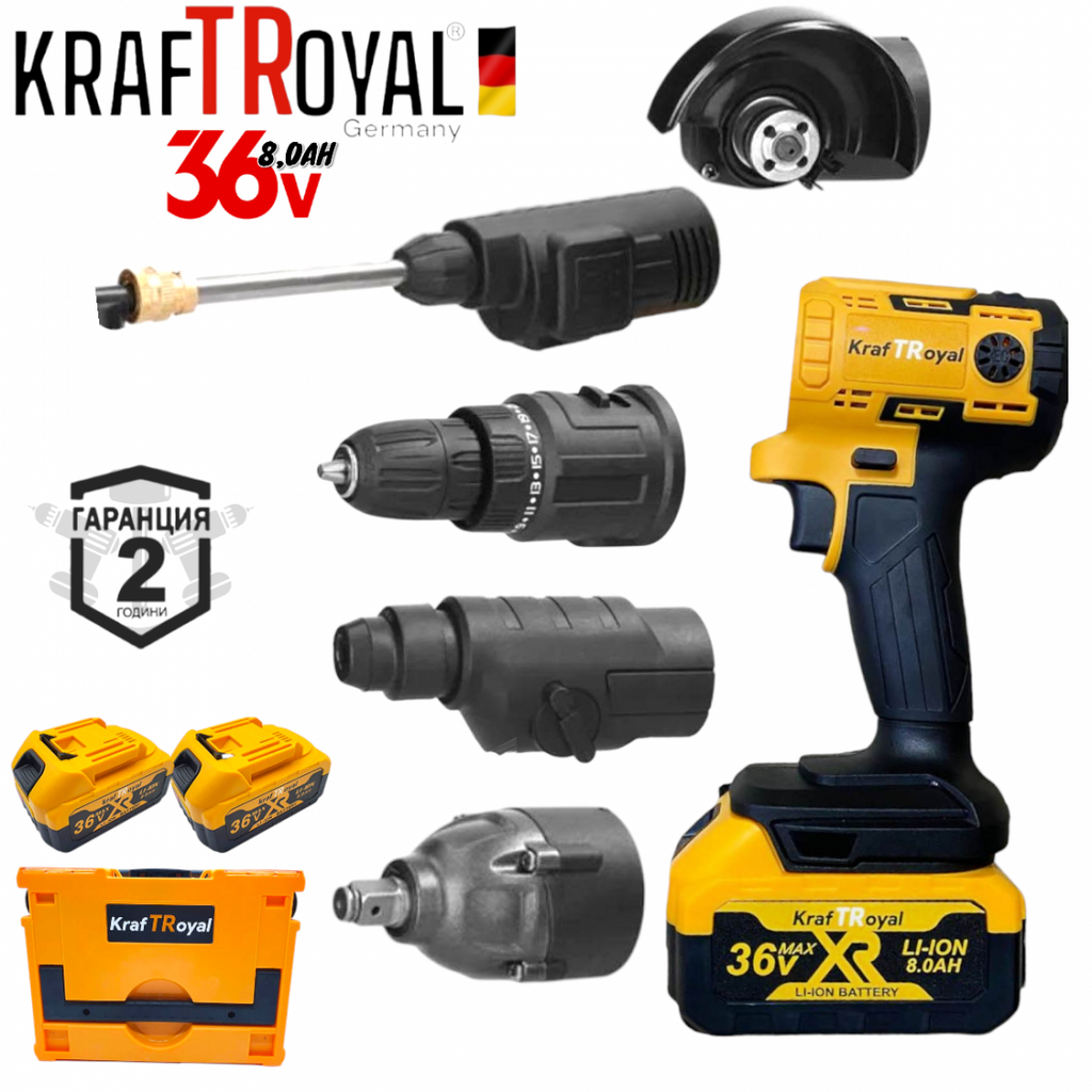 Мултифункционален Инструмент 5 Приставки Сменяеми KRAFTROYAL 36V Водоструйка Винтоверт Гайковерт-Импакт Перфоратор и Ъглошлайф Акумулаторен 2х Батерии