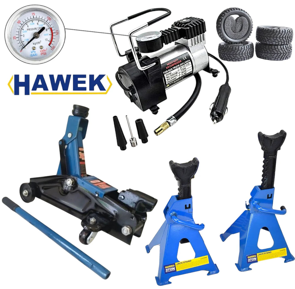 ПРОМО Компресор за Гуми + Крик 2 тона 135-320мм + Подпорни Стойки 3 тона 290-420мм HAWEK 3в1