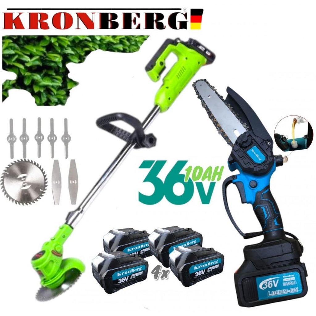 ПРОМО КОМПЛЕКТ 2в1 Акумулаторен Тример за Трева Косачка ХРАСТОРЕЗ 48V и Акумулаторна Резачка за КЛОНИ с Автоматично Омасляване на веригата (казанче за масло) 36V 10AH KRONBERG + 4 батерии