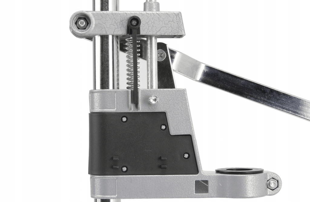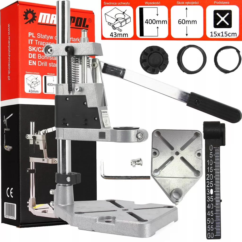 Универсална стойка за бормашина 400 мм Тази стойка превръща вашата бормашина в многофункционален и практичен уред Дълбочина на пробиване 60 мм Стойката ви позволява да променяте вертикално позицията на монтираната бормашина, благодарение на което е възможна стабилна работа, намалявайки вероятността от счупване или повреда на свредлото. Перфектният уред за прецизно пробиване на отвори в различни материали. Корпусът е изработен от алуминий, благодарение на което целият е лек и издръжлив. Работата на навесната бормашина се свежда до управление на пружинния лост, който позволява автоматично връщане на бормашината в изходна позиция.