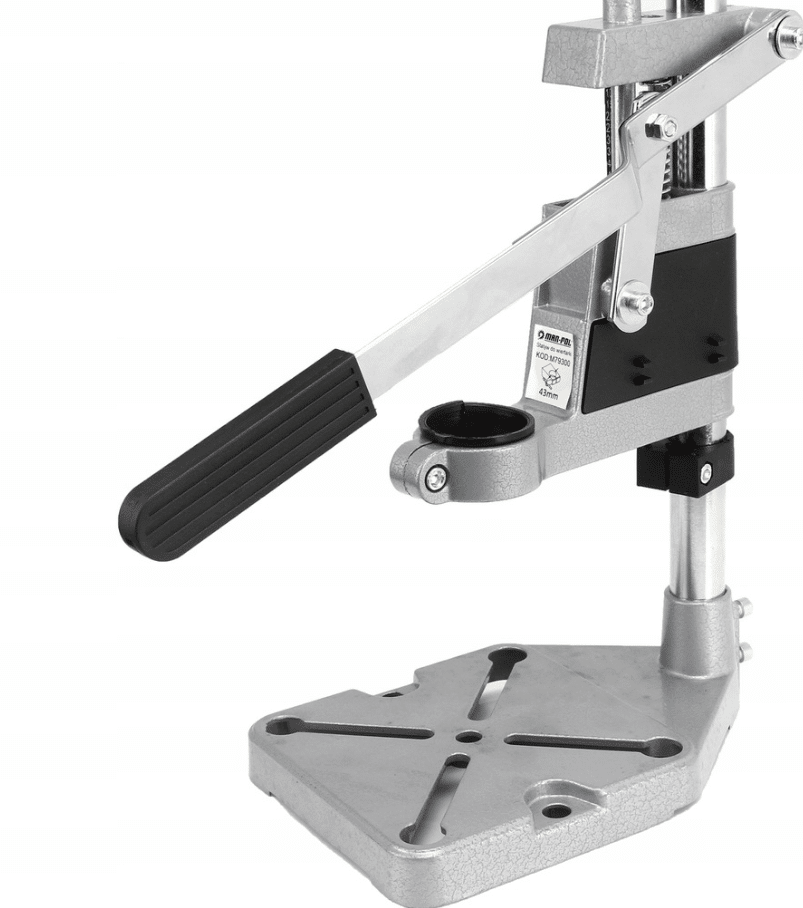Стойката е с универсален монтаж за повечето ръчни бормашини 25 - 43 mm. Полезен във всеки дом и занаятчийска работилница. ТЕХНИЧЕСКИ ДАННИ: Височина на стойката: 40см Отвор за закрепване на свредлото: от 25 до 43мм Отвор за монтаж в плот: ДА Жлебове за монтаж на менгеме: ДА Тегло: 1.8 кг Регулируема дълбочина на пробиване: 60 мм Вертикална настройка на свредлото (пробиване): ДА Голям работен плот Поставката е с размер на плота 15 х 15 см (квадратна основа), размерите на цялата основа са по-големи. В допълнение, плотът на масата е снабден с монтажни отвори и жлебове за монтиране на менгеме Ергономична дръжка Дръжката на дръжката е изработена от материал, който повишава комфорта при използване. Необходим в домашния гараж и професионална работилница ХАРАКТЕРИСТИКА: Високо качество и доказан дизайн Устойчивост, осигурена от алуминиева конструкция Универсален монтаж, съответстващ на повечето предлагани на пазара свредла 25 - 43 мм Работи чудесно в домашен гараж, работилница, професионален завод ВКЛЮЧЕНИ АДАПТЕРИ ЗА РЕГУЛИРАНЕ НА ДИАМЕТРИ ОТ 25 ДО 43 MM