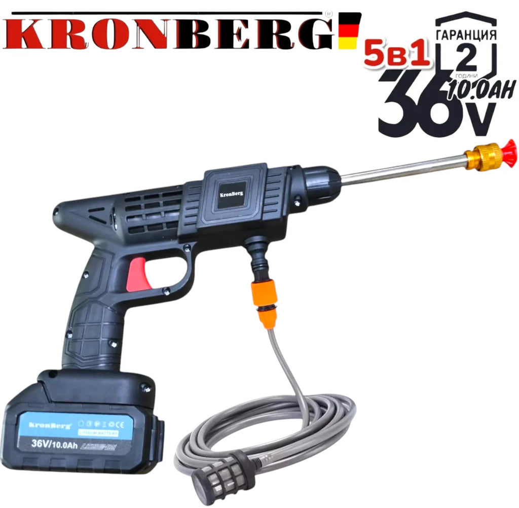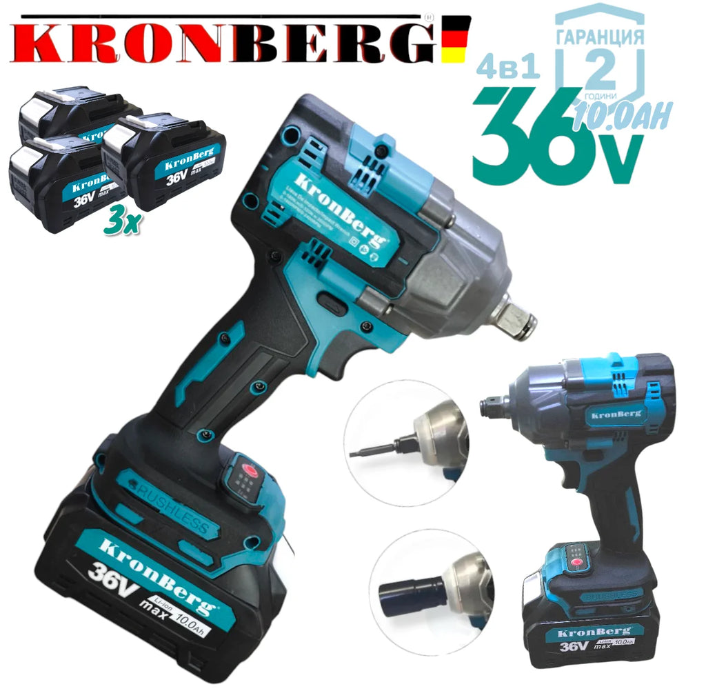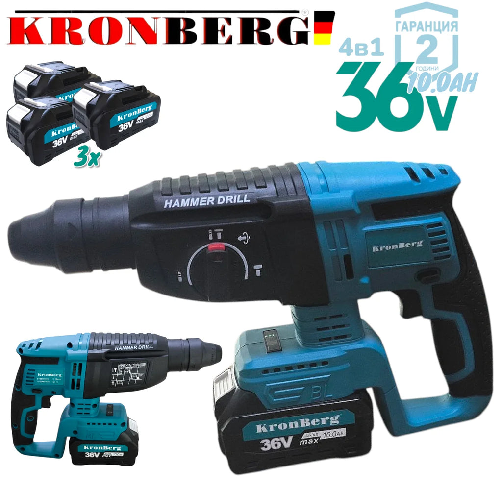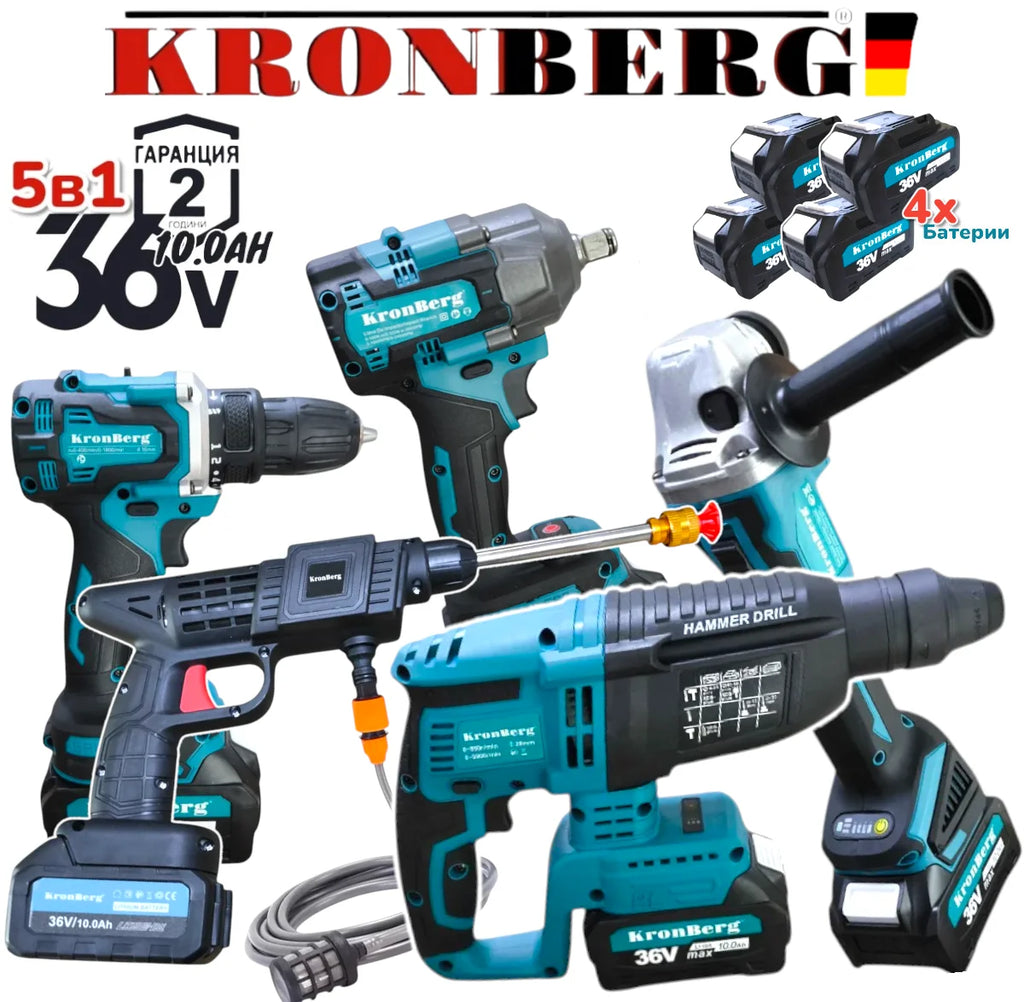 Акумулаторен Комплект Водоструйка Перфоратор Винтоверт Гайковерт-Импакт и Ъглошлайф 36V 10AH KRONBERG 5в1 с 4 Батерии