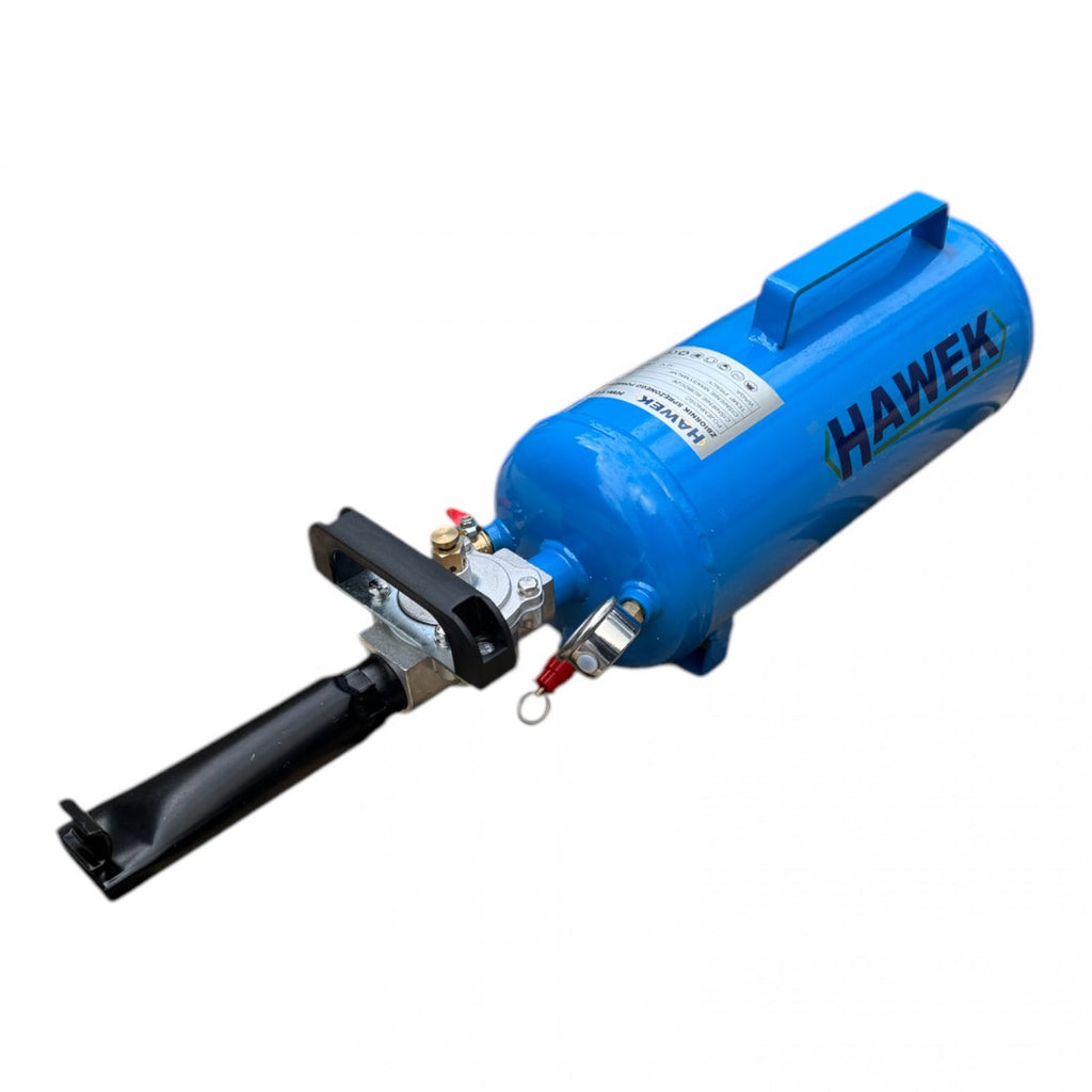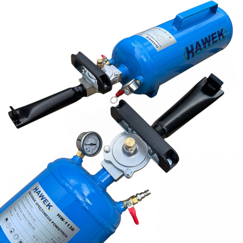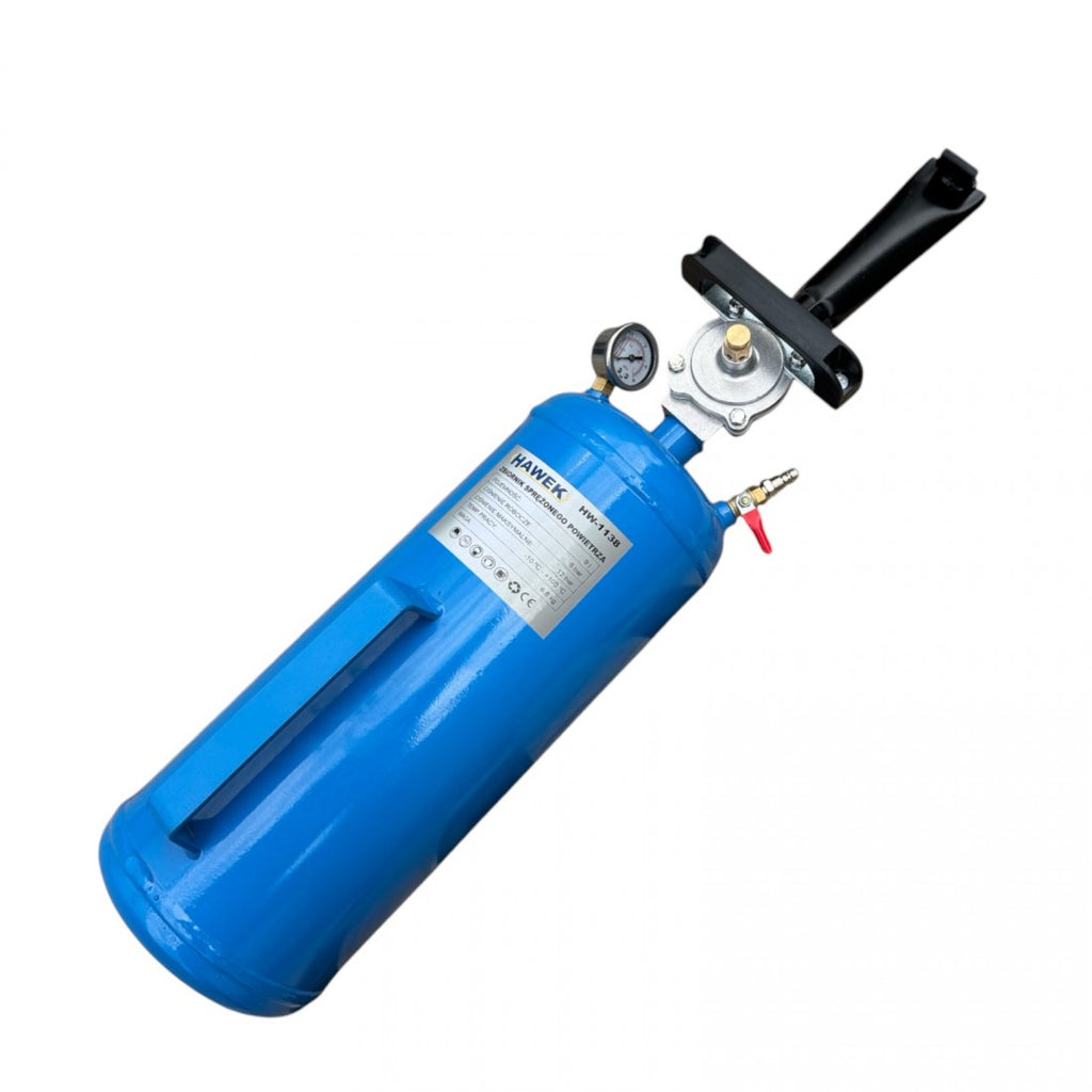Бутилка за взривно помпане на гуми HAWEK HW-1138 има захват 1/4", максимално налягане 12 бара и вместимост 9 л. Оборудвана е с предпазен клапан за препълване и манометър. Използва се за взривно помпане на безкамерни гуми в процеса на монтиране на гумата върху джантата. Резервоара може да се ползва за гуми на леки автомобили, микробуси и камиони.