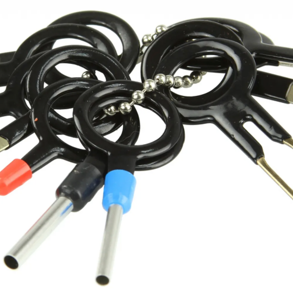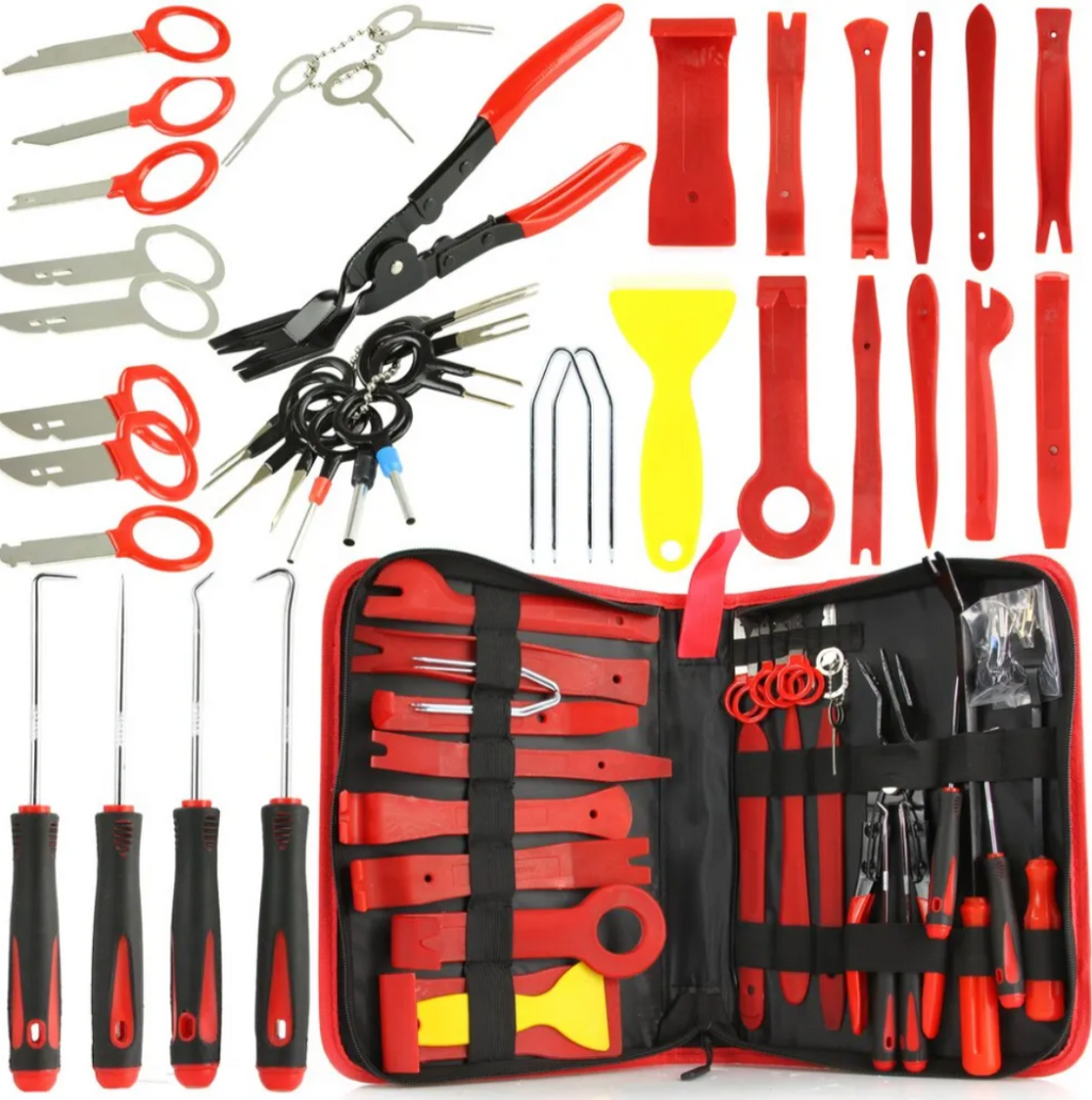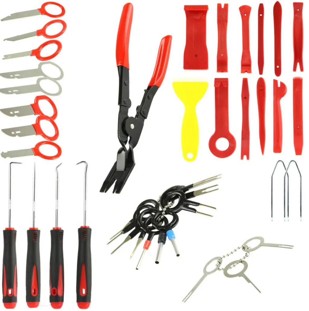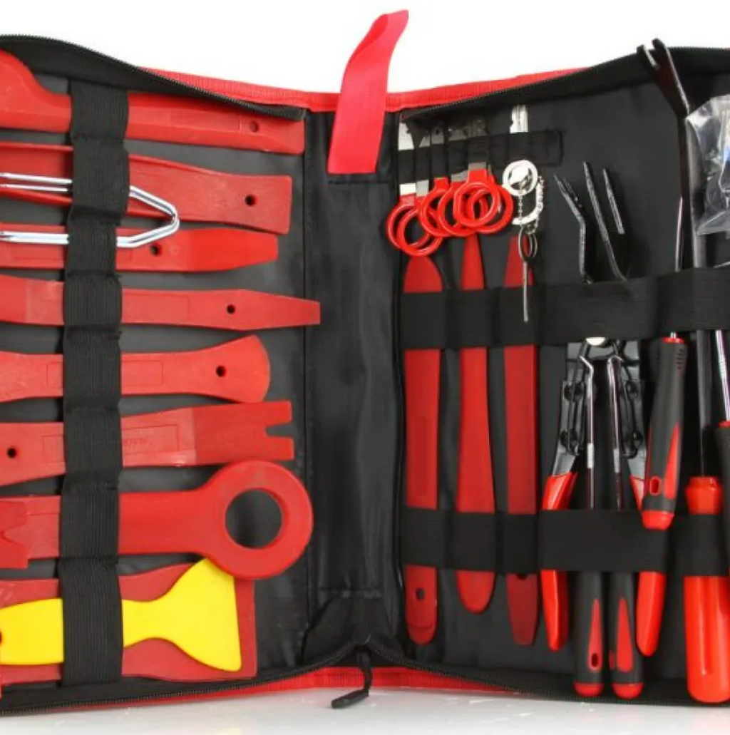 • Ъглова скоба за отстраняване на панели • Плоска щипка за отстраняване на панели • Clip Panel Remover (премахвач на зъбни панели) • Тапицерия Clip Remover (инструмент за премахване на тапицерия) • Тесен тип средство за отстраняване • Тип издърпване на премахване • Широк тип средство за отстраняване • Handy Remover (двустранен екстрактор) • Премахвач на панел (основен инструмент за премахване на панел) • Straight Panel Remover (прав панел отстраняване) • Sharp Panel Remover (остър инструмент за отстраняване на панели) • Шпатула • Пружинен разширител • Дълъг лост за тапицерия • Къс лост за тапицерия • Шишче • 45 градусова кука • 90 градусова кука • 135 градусова кука • Комплект за радиокасетофони (22 бр.)