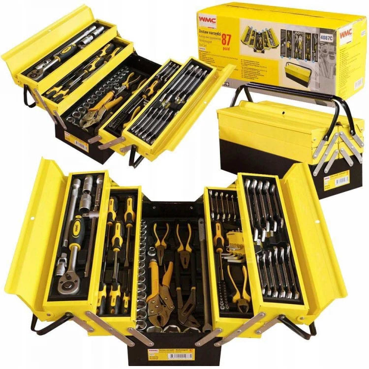 Инструментите на марката WMC са изработени от висококачествена хром-ванадиева стомана,което ги прави много издръжливи.Комплектът е затворен в плътна метална кутия,което го прави идеален за взимане със себе си,а също така и лесен за съхранение.Съставът на комплекта е избран да задоволи и най-взискателните клиенти.Той е перфектен като подарък за човек,който все още няма работилница,защото ще намери всички необходими инструменти в него.