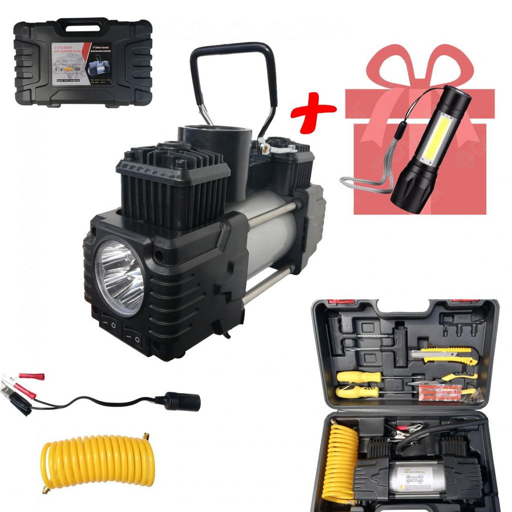 Компресор с изключително здрав метален корпус. Двуцилиндров компресор с манометър и спираловиден маркуч, осигуряващ много бързо помпане на гуми на автомобили и по-тежкотоварни МПС-та, различни надуваеми продукти като лодки, дюшеци, басейни, топки и др.