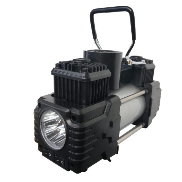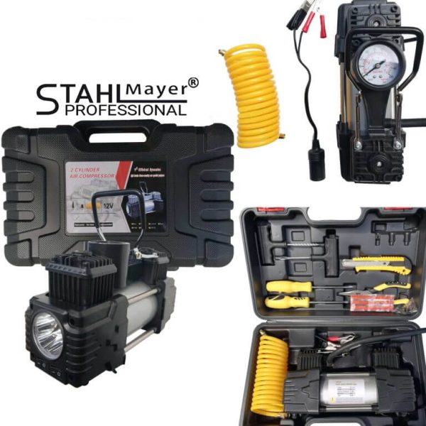Компресор с изключително здрав метален корпус. Двуцилиндров компресор с манометър и спираловиден маркуч, осигуряващ много бързо помпане на гуми на автомобили и по-тежкотоварни МПС-та, различни надуваеми продукти като лодки, дюшеци, басейни, топки и др.