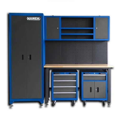 Комплект за сервизно оборудване HAWEK е необходим помощник за всеки гараж и работилница. Модулна работна маса предлага ефективно решение за съхранение на вашите инструменти в 6 модула. Шкафове и чекмеджета са оборудвани с ключалка.