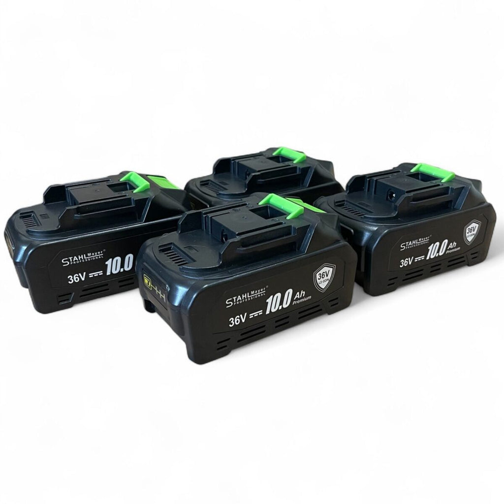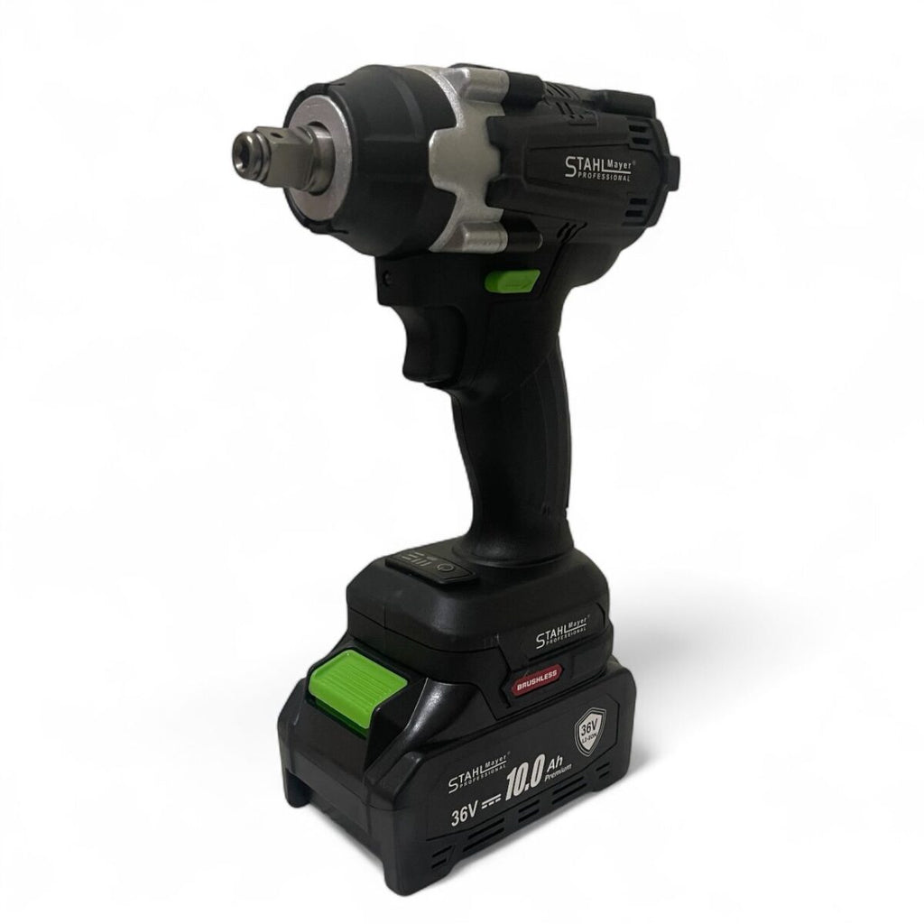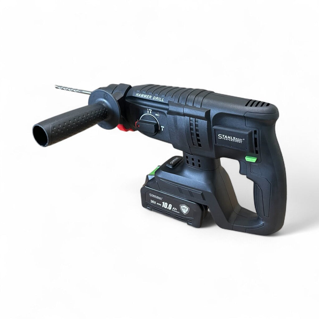 КОМПЛЕКТ 7 В 1 ОТ АКУМУЛАТОРЕН ПЕРФОРАТОР, ВИНТОВЕРТ, ГАЙКОВЕРТ, ЪГЛОШЛАЙФ, САБЛЕН ТРИОН , РЕЗАЧКА С ОМАСЛЯВАНЕ И LED ЛАМПА 36V 10AH - С 4 БАТЕРИИ И ЧАСТИ В КУФАР STAHLMAYER BLACK