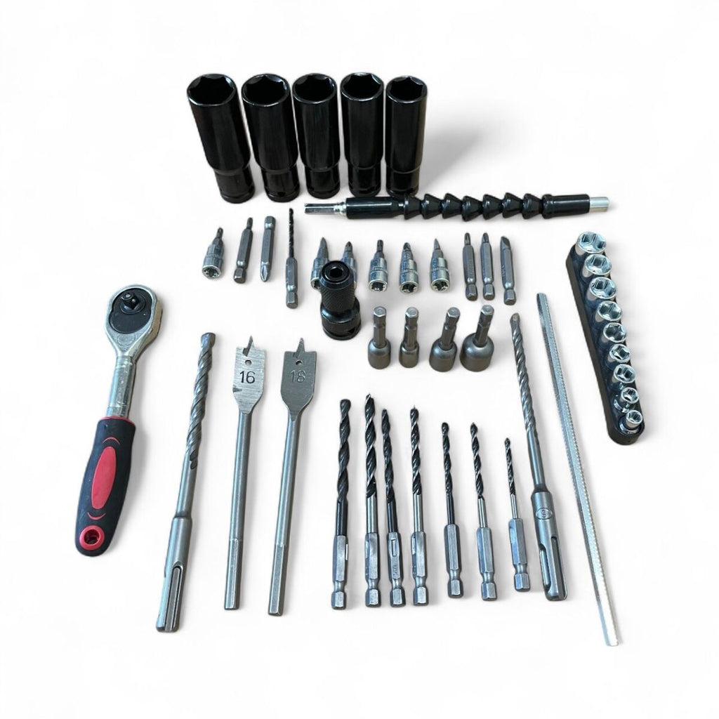 Комплект 7 в 1 от акумулаторен перфоратор, винтоверт, гайковерт, ъглошлайф, саблен трион , верижен трион  и LED лампа 36V 10Ah - с 4 батерии и  части в куфар StahlMayer Black