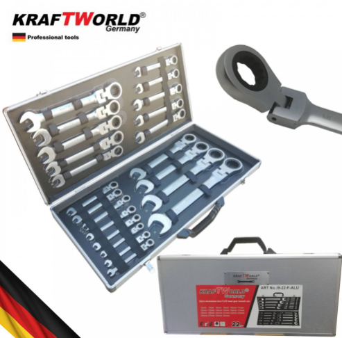 ПРОФЕСИОНАЛЕН НЕМСКИ К-т звездогаечни тресчотни ключове с чупещо рамо от 6мм до 32мм 22 части KraftRoyal