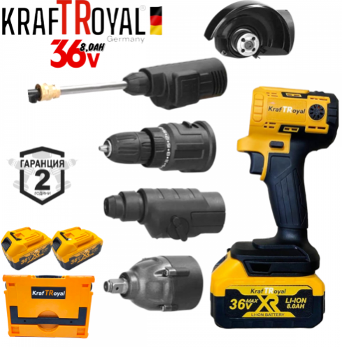Мултифункционален Инструмент 5 Сменяеми Глави Водоструйка Винтоверт Гайковерт-Импакт Перфоратор и Ъглошлайф Акумулаторен KRAFT ROYAL 36V 8,0AH 2х Батерии 5в1