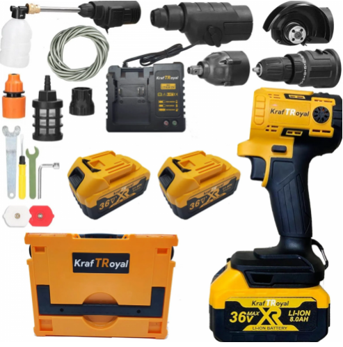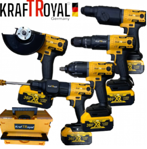 Мултифункционален Инструмент 5 Приставки Сменяеми KRAFTROYAL 36V Водоструйка Винтоверт Гайковерт-Импакт Перфоратор и Ъглошлайф Акумулаторен 2х Батерии