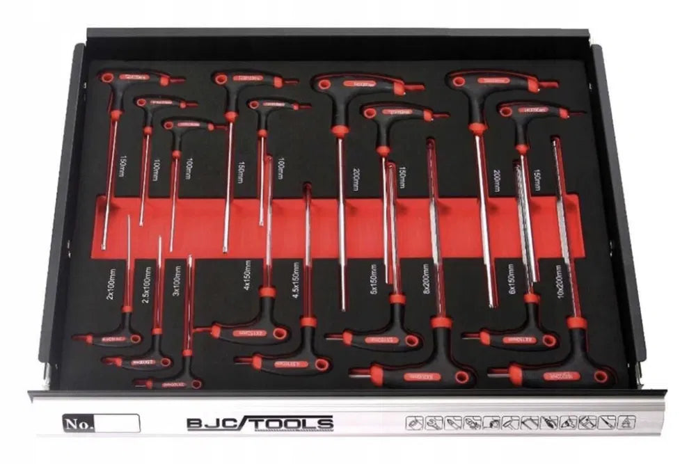Комплект шестостенни ключове 18 броя: 2 * 100, 2,5 * 100, 3 * 100, 4 * 150, 4,5 * 150, 5 * 150, 6 * 150, 8 * 200, 10 * 1 * 0,0,0,0 , T20 * 100, T25 * 150, T27 * 150, T30 * 150, T40 * 150, T45 * 200, T50 * 200