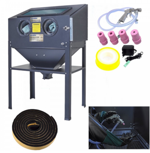 Пясъкоструйните кабини са устройства, които позволяват чисто, професионално, бързо и удобно пясъкоструене. Абразивите, циркулиращи в затворена верига, не изтичат навън, благодарение на което е възможно да се използват абразиви с по-високо качество от корунд, стъкло или метални стружки, без да се притеснявате за увеличаване на разходите. Машината е оборудвана с доказана система за управление, солидна и просторна камера със странична врата, солиден пясъкоструен пистолет, четири керамични дюзи, висококачествени работни ръкавици, осветление на работната зона, голям прозорец - визьор (без щора място). Препоръчаното устройство се предлага с компактен дизайн и голямо и просторно работно пространство, лекота на използване, надеждност и безопасност при работа. Работата без прах на уреда се осигурява от използването на периферни уплътнения, които позволяват работата да се извършва по екологичен начин. Струйният маркуч се намира в долната част на събирателния съд. Дренажният отвор позволява бърза смяна на пясъкоструйния материал.