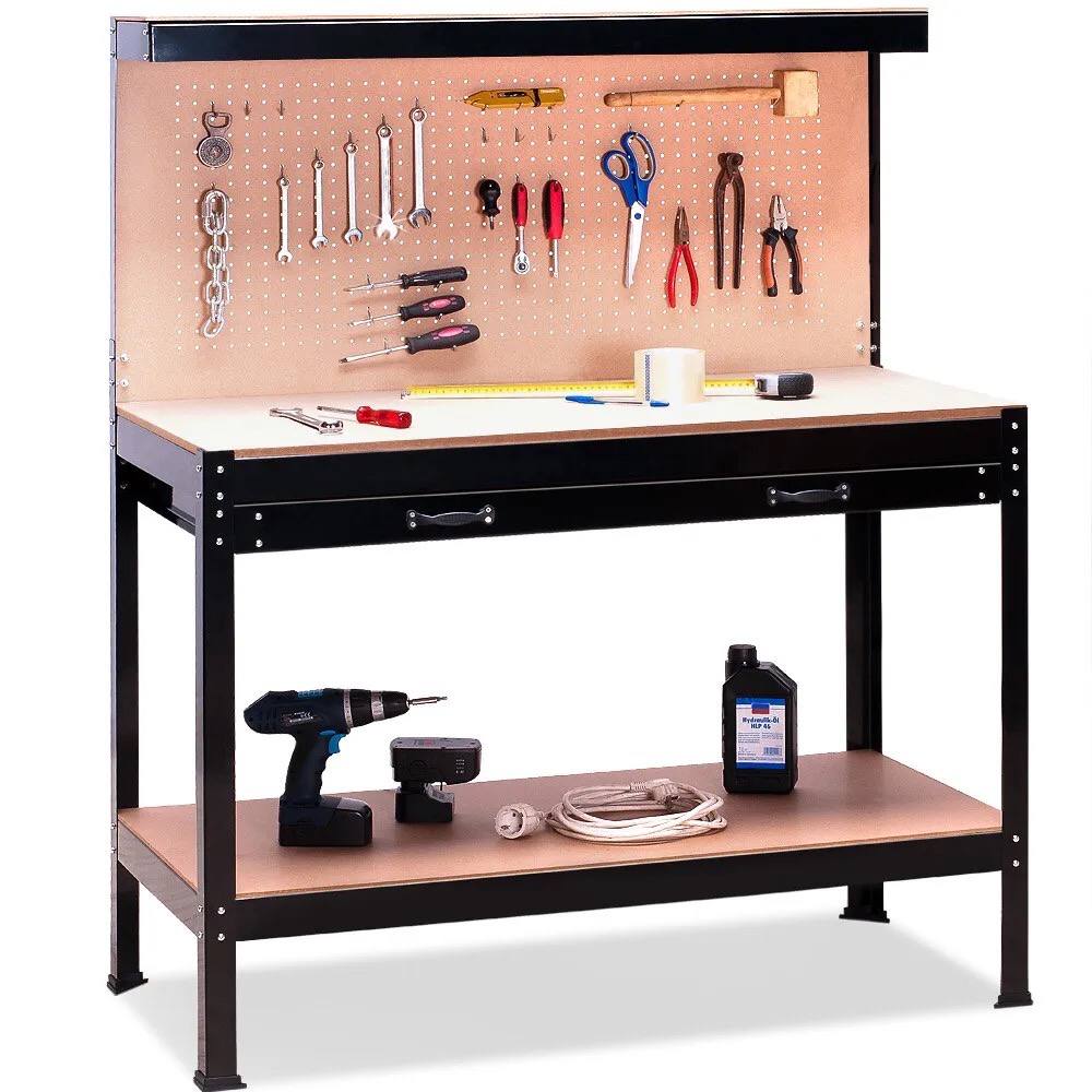 Стоманената работна маса е подходяща за професионална и лична употреба. Голямото чекмедже осигурява достатъчно пространство за съхранение на всичките ви инструменти и аксесоари. Вашите инструменти могат да са подредени на видно място и винаги да са под ръка, благодарение на стената за инструменти, оборудвана с куки. Обемистите инструменти могат да бъдат поставени на долния рафт. Благодарение на големия и стабилен работен плот, можете да работите ефективно с по-големи детайли. Изработена от висококачествена стомана и MDF, тази работна маса е стабилна и издръжлива. Работната маса може много лесно да се монтира. Аксесоарите за монтаж за включени.