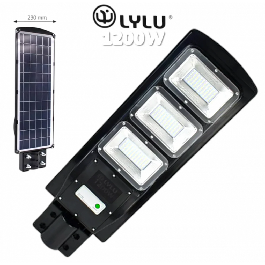 Улична соларна лампа Lylu 1200W. Осветително тяло е подходящо за монтаж на височина 3-5м. и площ на осветяемост до 200кв.м.